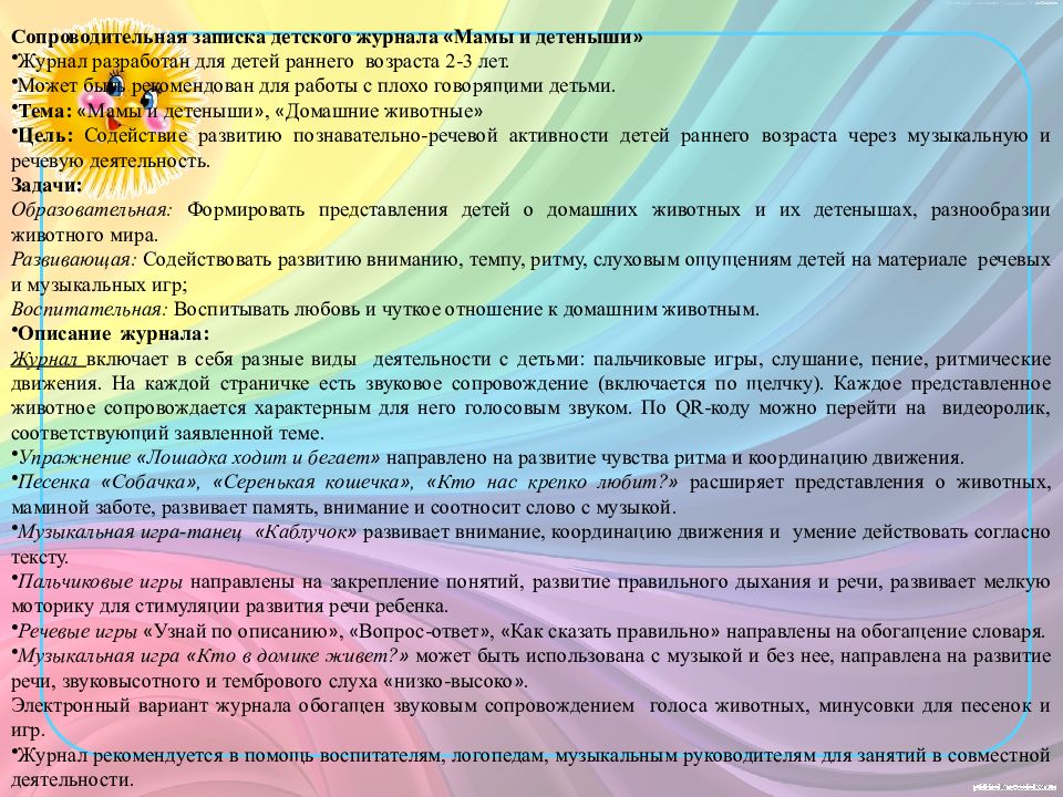 Сопроводительная записка детского журнала « Мамы и детеныши » Журнал разработан для детей раннего возраста 2-3 лет. Может быть рекомендован для работы с плохо говорящими детьми. Тема: « Мамы и детеныши », « Домашние животные » Цель: Содействие развитию познавательно-речевой активности детей раннего возраста через музыкальную и речевую деятельность. Задачи: Образовательная: Формировать представления детей о домашних животных и их детенышах, разнообразии животного мира. Развивающая: Содействовать развитию вниманию, темпу, ритму, слуховым ощущениям детей на материале речевых и музыкальных игр; Воспитательная: Воспитывать любовь и чуткое отношение к домашним животным. Описание журнала: Журнал включает в себя разные виды деятельности с детьми: пальчиковые игры, слушание, пение, ритмические движения. На каждой страничке есть звуковое сопровождение (включается по щелчку). Каждое представленное животное сопровождается характерным для него голосовым звуком. По QR -коду можно перейти на видеоролик, соответствующий заявленной теме. Упражнение « Лошадка ходит и бегает » направлено на развитие чувства ритма и координацию движения. Песенка « Собачка », « Серенькая кошечка », « Кто нас крепко любит? » расширяет представления о животных, маминой заботе, развивает память, внимание и соотносит слово с музыкой. Музыкальная игра-танец « Каблучок » развивает внимание, координацию движения и умение действовать согласно тексту. Пальчиковые игры направлены на закрепление понятий, развитие правильного дыхания и речи, развивает мелкую моторику для стимуляции развития речи ребенка. Речевые игры « Узнай по описанию », « Вопрос-ответ », « Как сказать правильно » направлены на обогащение словаря. Музыкальная игра « Кто в домике живет? » может быть использована с музыкой и без нее, направлена на развитие речи, звуковысотного и тембрового слуха « низко-высоко ». Электронный вариант журнала обогащен звуковым сопровождением голоса животных, минусовки для песенок и игр. Журнал рекомендуется в помощь воспитателям, логопедам, музыкальным руководителям для занятий в совместной деятельности.