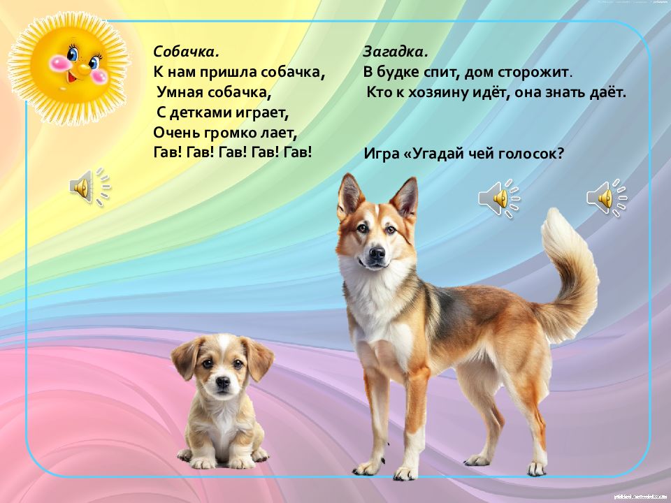 Собачка. К нам пришла собачка, Умная собачка, С детками играет, Очень громко лает, Гав ! Гав! Гав! Гав! Гав ! Загадка. В будке спит, дом сторожит. Кто к хозяину идёт, она знать даёт. Игра «Угадай чей голосок?