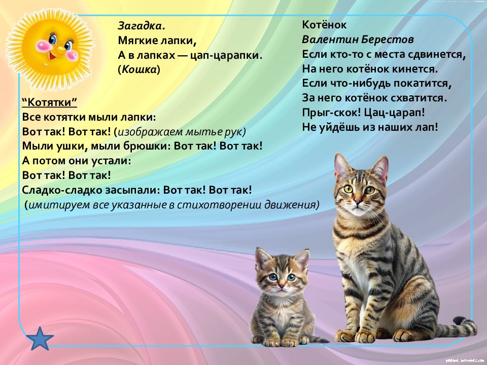 Загадка. Мягкие лапки, А в лапках — цап-царапки. ( Кошка ) “Котятки” Все котятки мыли лапки: Вот так! Вот так! ( изображаем мытье рук) Мыли ушки, мыли брюшки: Вот так! Вот так! А потом они устали: Вот так! Вот так! Сладко-сладко засыпали: Вот так! Вот так! ( имитируем все указанные в стихотворении движения) Котёнок Валентин Берестов Если кто-то с места сдвинется, На него котёнок кинется. Если что-нибудь покатится, За него котёнок схватится. Прыг-скок! Цац-царап ! Не уйдёшь из наших лап !