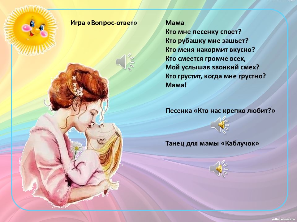 Игра «Вопрос-ответ» Мама Кто мне песенку споет? Кто рубашку мне зашьет? Кто меня накормит вкусно? Кто смеется громче всех, Мой услышав звонкий смех? Кто грустит, когда мне грустно? Мама! Песенка «Кто нас крепко любит?» Танец для мамы «Каблучок»