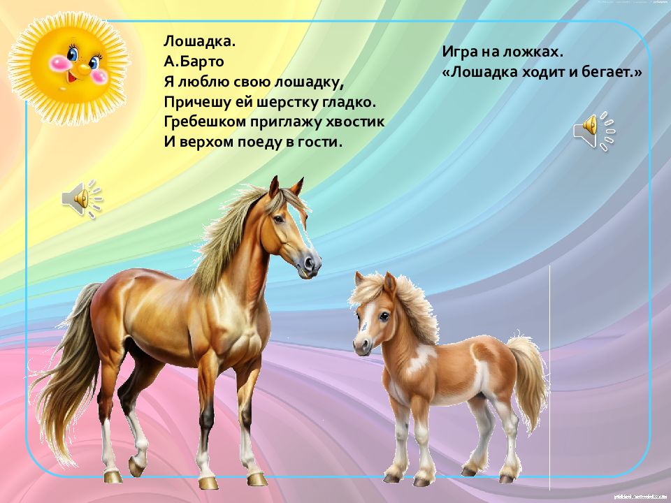 Лошадка. А.Барто Я люблю свою лошадку, Причешу ей шерстку гладко. Гребешком приглажу хвостик И верхом поеду в гости. Игра на ложках. «Лошадка ходит и бегает.»