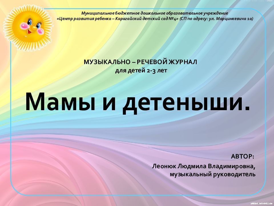 АВТОР: Леонюк Людмила Владимировна, музыкальный руководитель Муниципальное бюджетное дошкольное образовательное учреждение «Центр развития ребенка – Карагайский детский сад №4» (СП по адресу: ул. Марцинкевича 1а) МУЗЫКАЛЬНО – РЕЧЕВОЙ ЖУРНАЛ для детей 2-3 лет