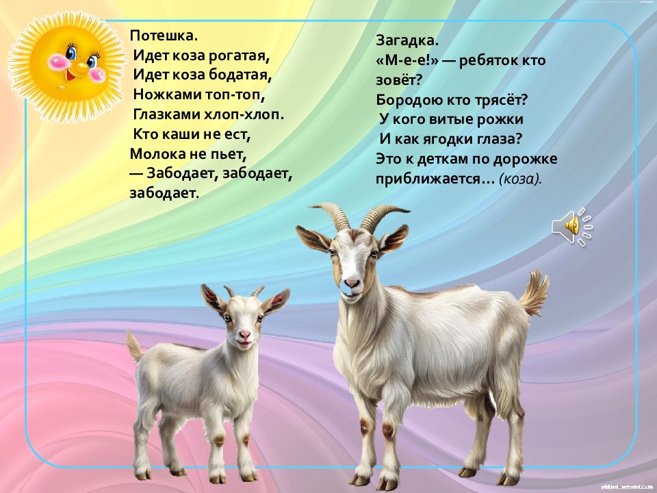 Потешка. Идет коза рогатая, Идет коза бодатая, Ножками топ-топ, Глазками хлоп-хлоп. Кто каши не ест, Молока не пьет, — Забодает, забодает, забодает. Загадка. «М-е-е!» — ребяток кто зовёт? Бородою кто трясёт? У кого витые рожки И как ягодки глаза? Это к деткам по дорожке приближается… (коза).