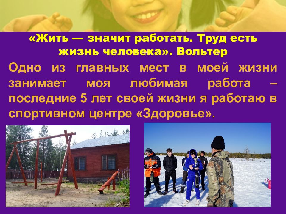 Одно из главных мест в моей жизни занимает моя любимая работа – последние 5 лет своей жизни я работаю в спортивном центре «Здоровье».