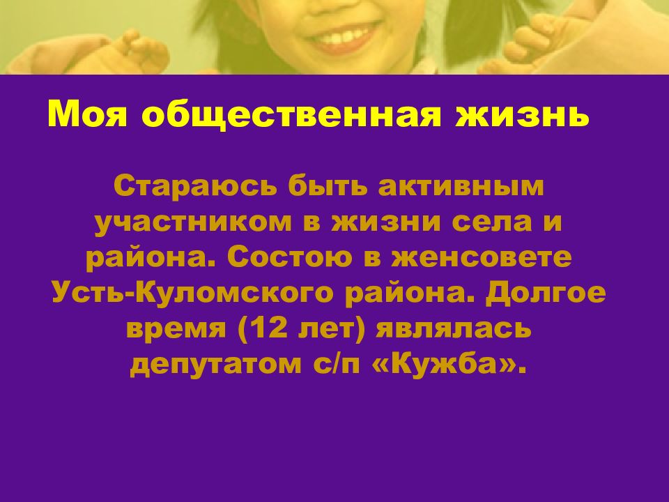 Стараюсь быть активным участником в жизни села и района. Состою в женсовете Усть-Куломского района. Долгое время (12 лет) являлась депутатом с/п « Кужба ».