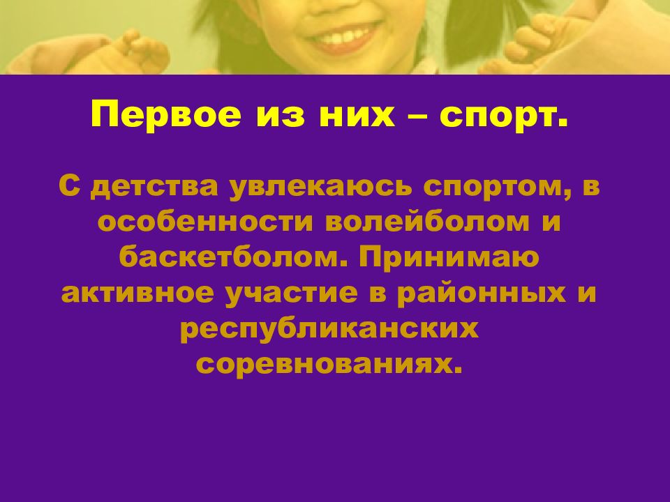 С детства увлекаюсь спортом, в особенности волейболом и баскетболом. Принимаю активное участие в районных и республиканских соревнованиях.