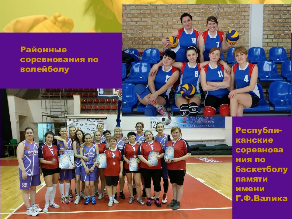 Районные соревнования по волейболу Республи-канские соревнования по баскетболу памяти имени Г.Ф.Валика