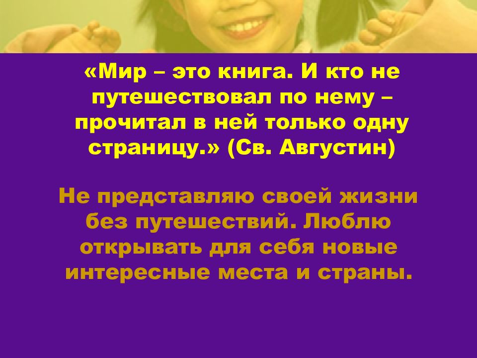 Слайд 12: Мир – это книга. И кто не путешествовал по нему – прочитал в ней только одну страницу.» (Св. Августин)