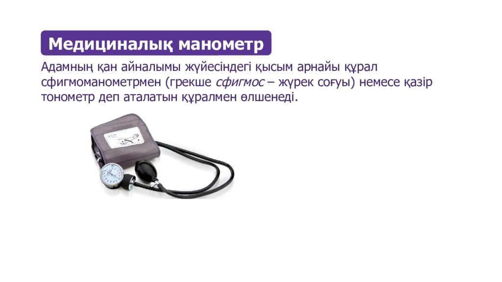 Медициналық манометр Адамның қан айналымы жүйесіндегі қысым арнайы құрал сфигмоманометрмен ( грекше сфигмос – жүрек соғуы ) немесе қазір тонометр деп аталатын құралмен өлшенеді.