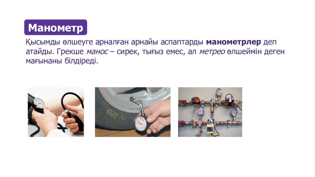 Манометр Қысымды өлшеуге арналған арнайы аспаптарды манометрлер деп атайды. Грекше манос – сирек, тығыз емес, ал метрео өлшеймін деген мағынаны білдіреді.
