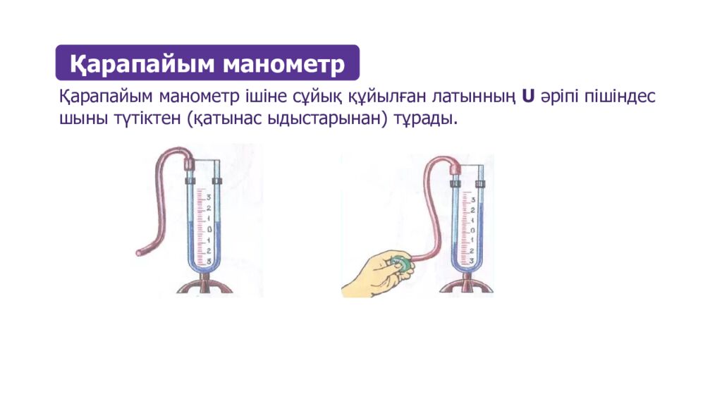 Қарапайым манометр Қарапайым манометр ішіне сұйық құйылған латынның U әріпі пішіндес шыны түтіктен (қатынас ыдыстарынан) тұрады.