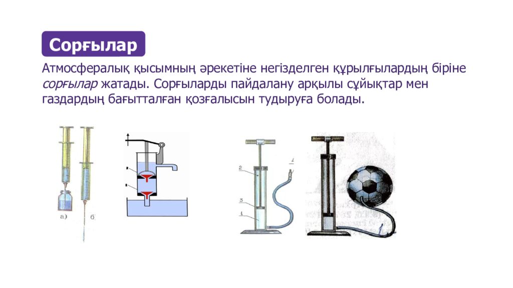 Сорғылар Атмосфералық қысымның әрекетіне негізделген құрылғылардың біріне сорғылар жатады. Сорғыларды пайдалану арқылы сұйықтар мен газдардың бағытталған қозғалысын тудыруға болады.