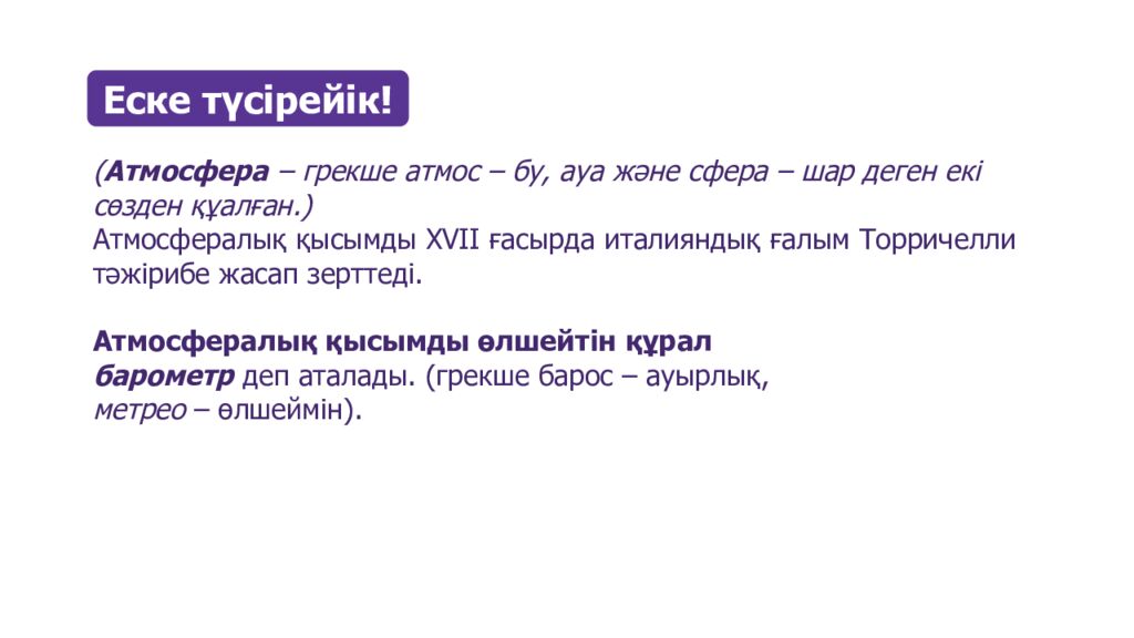 Еске түсірейік! ( Атмосфера – грекше атмос – бу, ауа және сфера – шар деген екі сөзден құалған.) Атмосфералық қысымды XVII ғасырда италияндық ғалым Торричелли тәжірибе жасап зерттеді. Атмосфералық қысымды өлшейтін құрал барометр деп аталады. ( грекше барос – ауырлық, метрео – өлшеймін ).