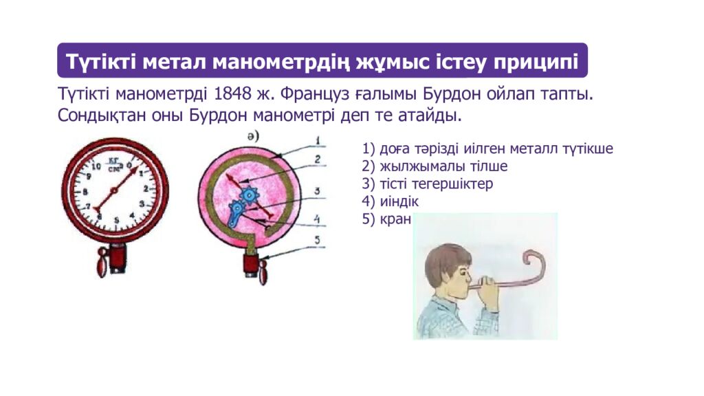 Түтікті метал манометрдің жұмыс істеу приципі Түтікті манометрді 1848 ж. Француз ғалымы Бурдон ойлап тапты. Сондықтан оны Бурдон манометрі деп те атайды. 1 ) доға тәрізді иілген металл түтікше 2) ж ылжымалы тілше 3) т істі тегершіктер 4) и індік 5) кран