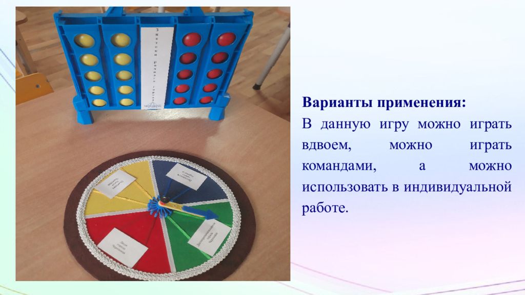 Варианты применения: В данную игру можно играть вдвоем, можно играть командами, а можно использовать в индивидуальной работе.