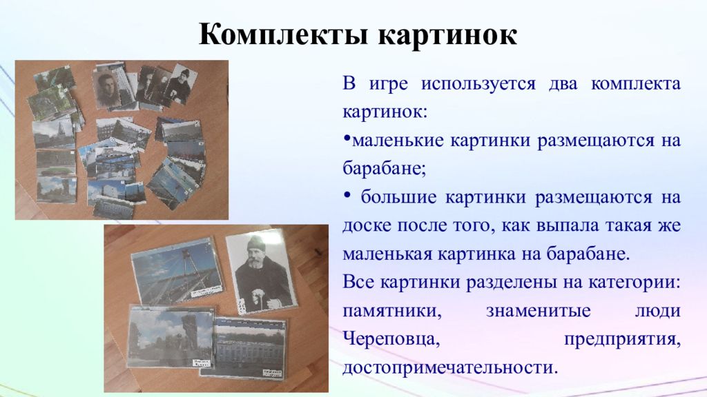В игре используется два комплекта картинок: маленькие картинки размещаются на барабане; большие картинки размещаются на доске после того, как выпала такая же маленькая картинка на барабане. Все картинки разделены на категории: памятники, знаменитые люди Череповца, предприятия, достопримечательности.