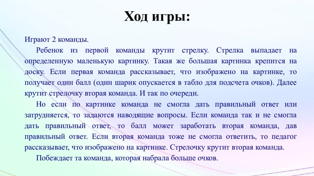 Играют 2 команды. Ребенок из первой команды крутит стрелку. Стрелка выпадает на определенную маленькую картинку. Такая же большая картинка крепится на доску. Если первая команда рассказывает, что изображено на картинке, то получает один балл (один шарик опускается в табло для подсчета очков). Далее крутит стрелочку вторая команда. И так по очереди. Но если по картинке команда не смогла дать правильный ответ или затрудняется, то задаются наводящие вопросы. Если команда так и не смогла дать правильный ответ, то балл может заработать вторая команда, дав правильный ответ. Если вторая команда тоже не смогла ответить, то педагог рассказывает, что изображено на картинке. Стрелочку крутит вторая команда. Побеждает та команда, которая набрала больше очков.