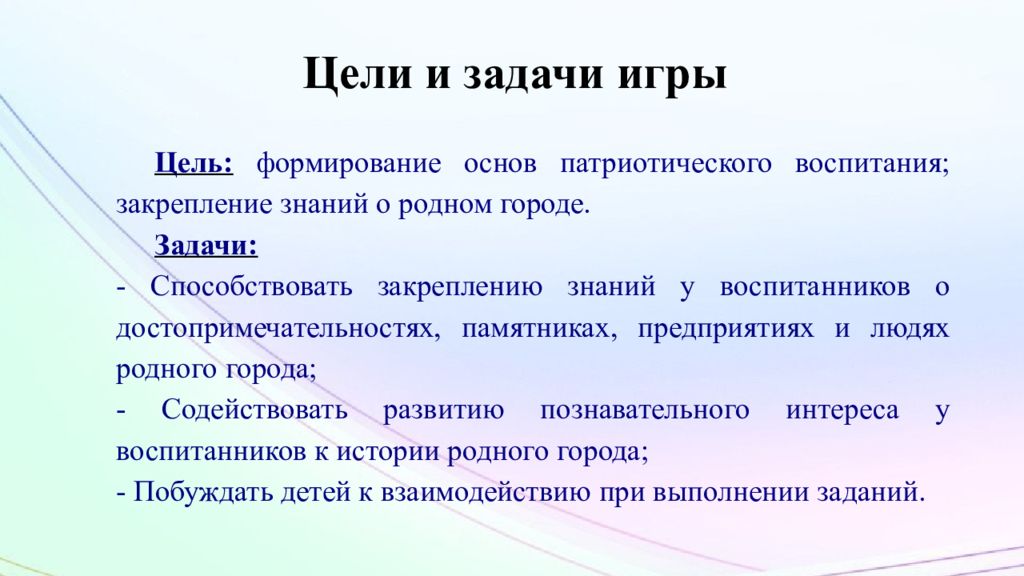 Цель: формирование основ патриотического воспитания; закрепление знаний о родном городе. Задачи: - Способствовать закреплению знаний у воспитанников о достопримечательностях, памятниках, предприятиях и людях родного города; - Содействовать развитию познавательного интереса у воспитанников к истории родного города; - Побуждать детей к взаимодействию при выполнении заданий.