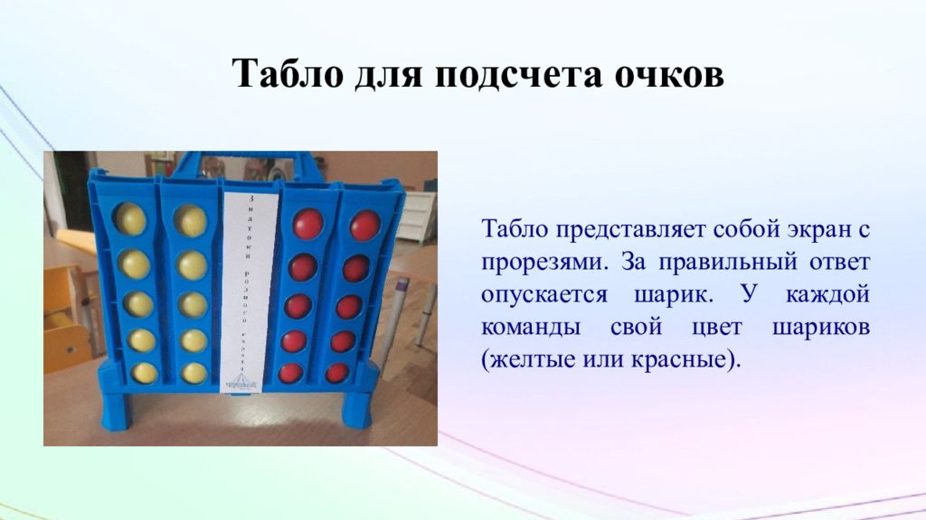 Табло представляет собой экран с прорезями. За правильный ответ опускается шарик. У каждой команды свой цвет шариков (желтые или красные).