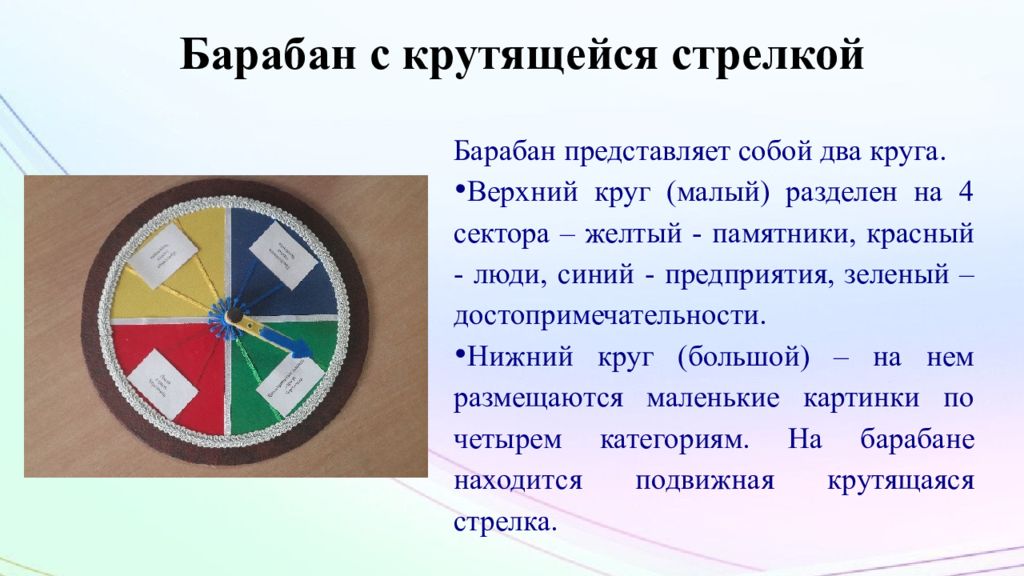 Барабан представляет собой два круга. Верхний круг (малый) разделен на 4 сектора – желтый - памятники, красный - люди, синий - предприятия, зеленый – достопримечательности. Нижний круг (большой) – на нем размещаются маленькие картинки по четырем категориям. На барабане находится подвижная крутящаяся стрелка.
