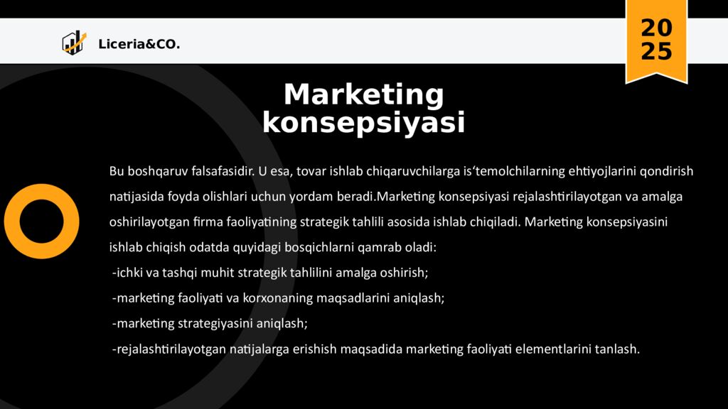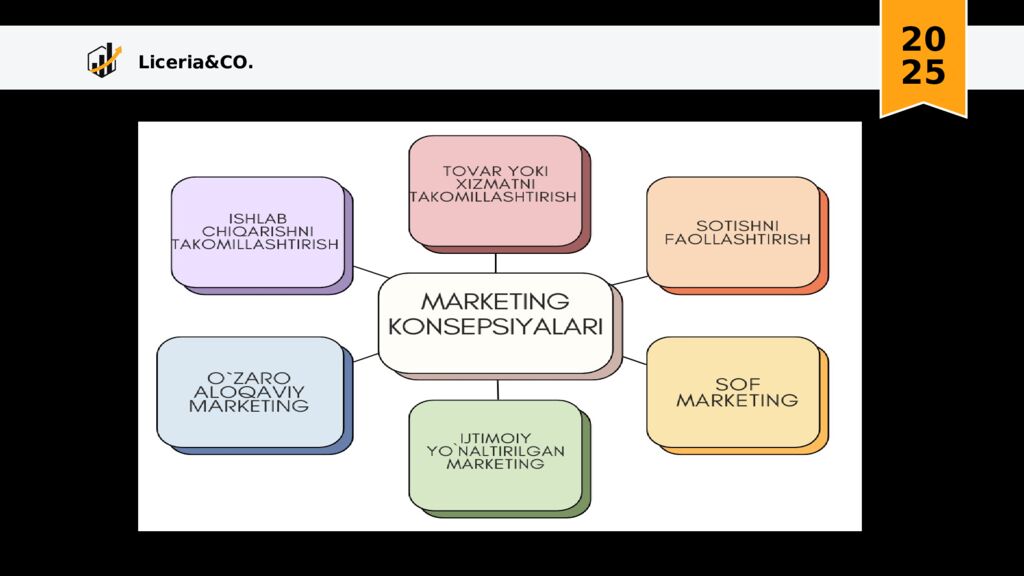 Liceria&CO. 20 25 Marketing konsepsiyasi Bu boshqaruv falsafasidir. U esa, tovar ishlab chiqaruvchilarga is‘temolchilarning ehtiyojlarini qondirish natijasida foyda olishlari uchun yordam beradi.Marketing konsepsiyasi rejalashtirilayotgan va amalga oshirilayotgan firma faoliyatining strategik tahlili asosida ishlab chiqiladi. Marketing konsepsiyasini ishlab chiqish odatda quyidagi bosqichlarni qamrab oladi : - ichki va tashqi muhit strategik tahlilini amalga oshirish ; -marketing faoliyati va korxonaning maqsadlarini aniqlash ; -marketing strategiyasini aniqlash ; - rejalashtirilayotgan natijalarga erishish maqsadida marketing faoliyati elementlarini tanlash.