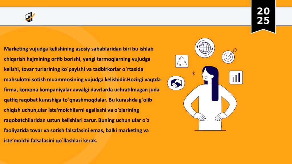 20 25 Marketing vujudga kelishining asosiy sabablaridan biri bu ishlab chiqarish hajmining ortib borishi, yangi tarmoqlarning vujudga kelishi, tovar turlarining ko`payishi va tadbirkorlar o`rtasida mahsulotni sotish muammosining vujudga kelishidir.Hozirgi vaqtda firma, korxona kompaniyalar avvalgi davrlarda uchratilmagan juda qattiq raqobat kurashiga to`qnashmoqdalar. Bu kurashda g`olib chiqish uchun,ular iste‘molchilarni egallashi va o`zlarining raqobatchilaridan ustun kelishlari zarur. Buning uchun ular o`z faoliyatida tovar va sotish falsafasini emas, balki marketing va iste‘molchi falsafasini qo`llashlari kerak.