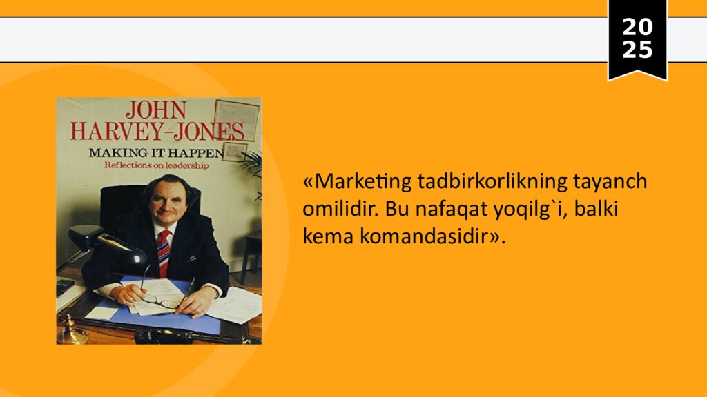 20 25 «Marketing tadbirkorlikning tayanch omilidir. Bu nafaqat yoqilg`i, balki kema komandasidir ».