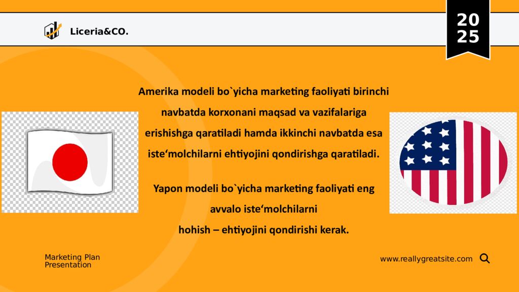 Liceria&CO. 20 25 Marketing Plan Presentation www.reallygreatsite.com Amerika modeli bo`yicha marketing faoliyati birinchi navbatda korxonani maqsad va vazifalariga erishishga qaratiladi hamda ikkinchi navbatda esa iste‘molchilarni ehtiyojini qondirishga qaratiladi. Yapon modeli bo`yicha marketing faoliyati eng avvalo iste‘molchilarni hohish – ehtiyojini qondirishi kerak.