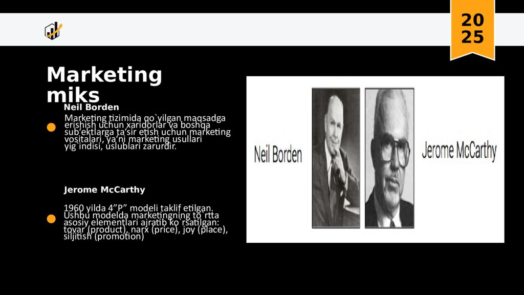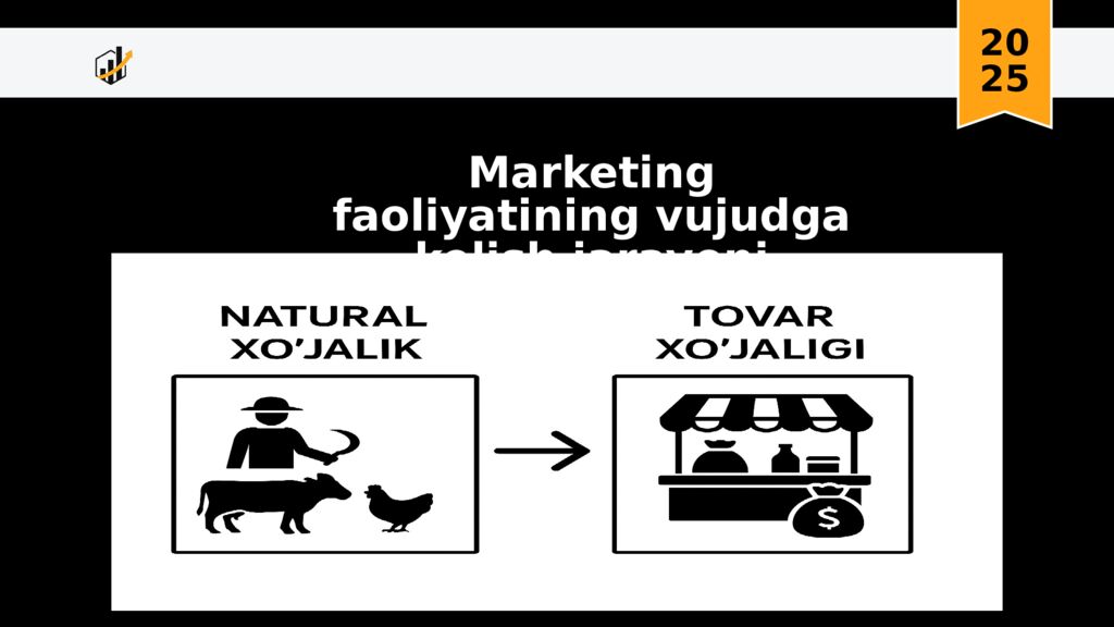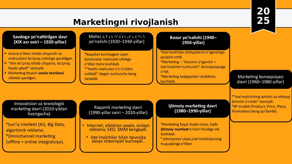20 25 Asosiy e’tibor ishlab chiqarish va mahsulotni ko‘proq sotishga qaratilgan. “Kim ko‘proq ishlab chiqarsa, ko‘proq foyda qiladi ” tamoyili. Marketing deyarli savdo texnikasi sifatida qaralgan. Savdoga yo‘naltirilgan davr (XIX asr oxiri – 1920-yillar) Internet, elektron savdo, onlayn reklama, SEO, SMM kengaydi. Iste’molchilar bilan bevosita aloqa imkoniyati kuchaydi.. Raqamli marketing davri (1990-yillar oxiri – 2010-yillar) . Bozor yo‘nalishi (1940–1950-yillar) Mahsulot va ishlab chiqarish yo‘nalishi (1920–1930-yillar) Innovatsion va texnologik marketing davri (2010-yildan hozirgacha ) Marketingni rivojlanish bosqichlari Marketing konsepsiyasi davri (1960–1980-yillar) Raqobat kuchaygani sayin korxonalar mahsulot sifatiga e’tibor bera boshladi. “ Yaxshi mahsulot o‘z-o‘zidan sotiladi ” degan tushuncha keng tarqaldi. Iste’molchilar ehtiyojlarini o‘rganishga qiziqish ortdi. Marketing – “ bozorni o‘rganish + iste’molchini tushunish ” konsepsiyasiga o‘tdi. Marketing tadqiqotlari shakllana boshladi. “ Iste’molchining xohishi va ehtiyoji birinchi o‘rinda ” tamoyili. 4P modeli (Product, Price, Place, Promotion ) keng qo‘llanildi. Ijtimoiy marketing davri (1980–1990-yillar) Marketing faqat foyda emas, balki ijtimoiy manfaat ni ham hisobga ola boshladi. jtimoiymas’uliyat,iste’molchilarning huquqlariga e’tibor. Sun’iy intellekt (AI), Big Data, algoritmik reklama. Omnichannel marketing ( offline + online integratsiya ).