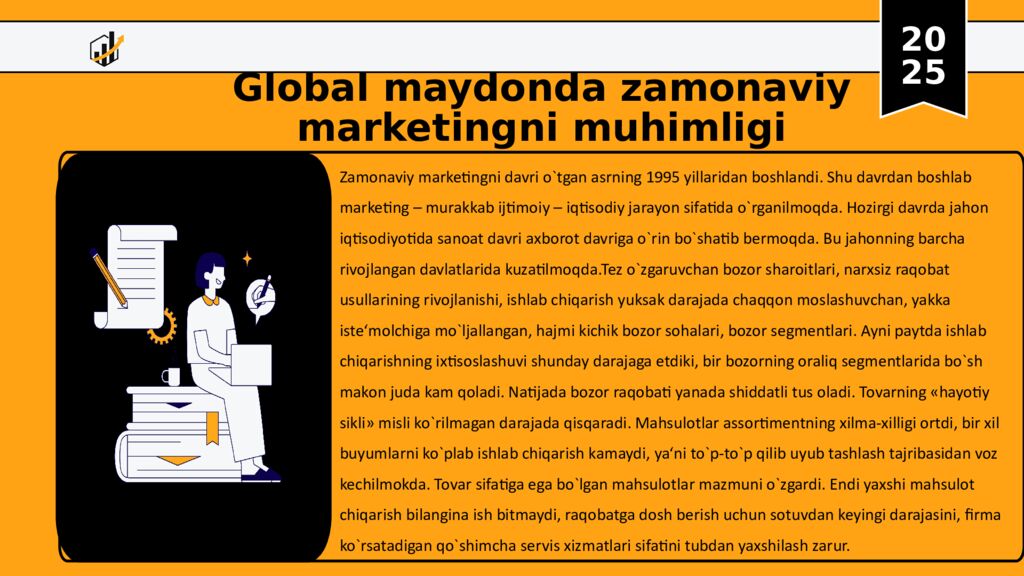 20 25 Global maydonda zamonaviy marketingni muhimligi Zamonaviy marketingni davri o`tgan asrning 1995 yillaridan boshlandi. Shu davrdan boshlab marketing – murakkab ijtimoiy – iqtisodiy jarayon sifatida o`rganilmoqda. Hozirgi davrda jahon iqtisodiyotida sanoat davri axborot davriga o`rin bo`shatib bermoqda. Bu jahonning barcha rivojlangan davlatlarida kuzatilmoqda.Tez o`zgaruvchan bozor sharoitlari, narxsiz raqobat usullarining rivojlanishi, ishlab chiqarish yuksak darajada chaqqon moslashuvchan, yakka iste‘molchiga mo`ljallangan, hajmi kichik bozor sohalari, bozor segmentlari. Ayni paytda ishlab chiqarishning ixtisoslashuvi shunday darajaga etdiki, bir bozorning oraliq segmentlarida bo`sh makon juda kam qoladi. Natijada bozor raqobati yanada shiddatli tus oladi. Tovarning « hayotiy sikli » misli ko`rilmagan darajada qisqaradi. Mahsulotlar assortimentning xilma-xilligi ortdi, bir xil buyumlarni ko`plab ishlab chiqarish kamaydi, ya‘ni to`p-to`p qilib uyub tashlash tajribasidan voz kechilmokda. Tovar sifatiga ega bo`lgan mahsulotlar mazmuni o`zgardi. Endi yaxshi mahsulot chiqarish bilangina ish bitmaydi, raqobatga dosh berish uchun sotuvdan keyingi darajasini, firma ko`rsatadigan qo`shimcha servis xizmatlari sifatini tubdan yaxshilash zarur.