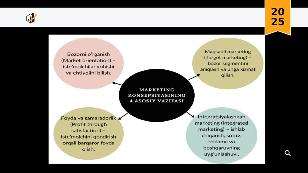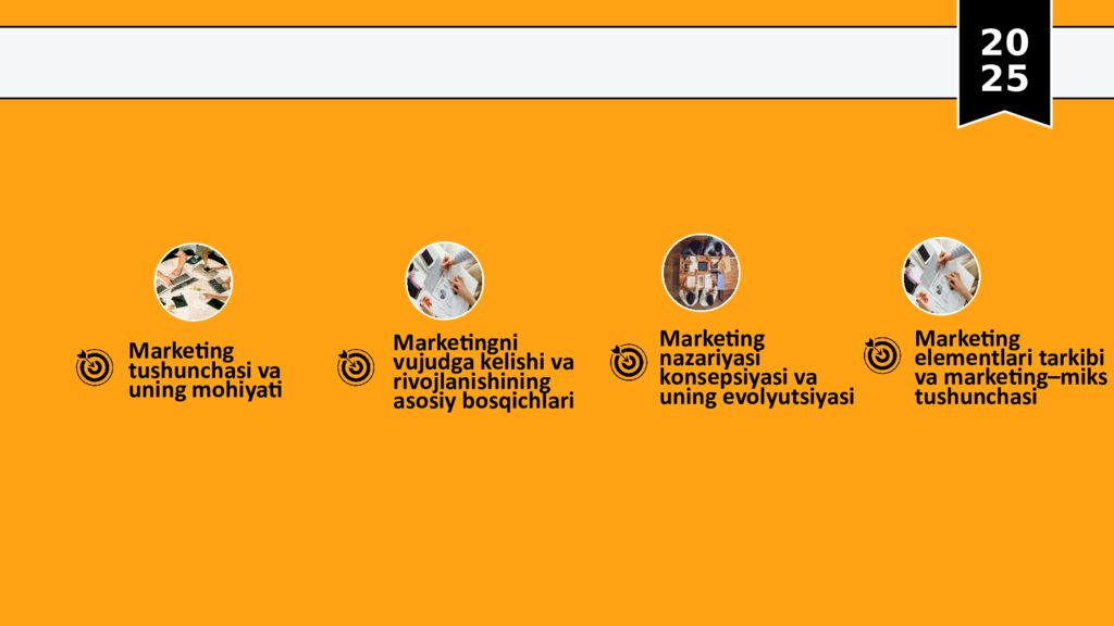 20 25 Marketing tushunchasi va uning mohiyati Marketingni vujudga kelishi va rivojlanishining asosiy bosqichlari Marketing nazariyasi konsepsiyasi va uning evolyutsiyasi Marketing elementlari tarkibi va marketing– miks tushunchasi