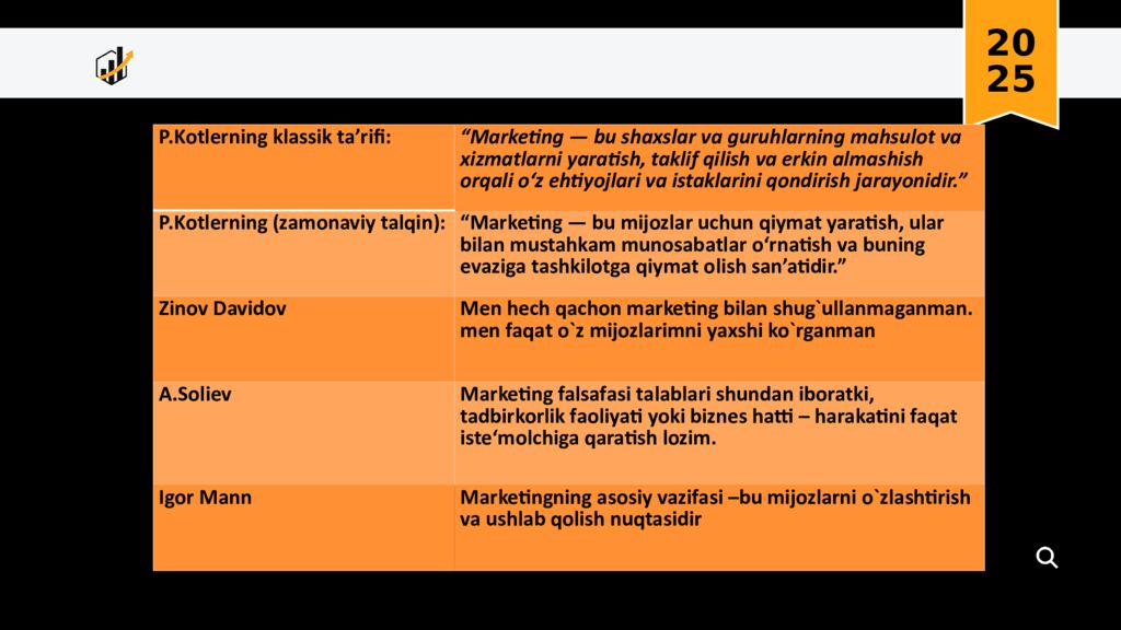 20 25 P.Kotlerning klassik ta’rifi : “ Marketing — bu shaxslar va guruhlarning mahsulot va xizmatlarni yaratish, taklif qilish va erkin almashish orqali o‘z ehtiyojlari va istaklarini qondirish jarayonidir.” P.Kotlerning ( zamonaviy talqin ): “Marketing — bu mijozlar uchun qiymat yaratish, ular bilan mustahkam munosabatlar o‘rnatish va buning evaziga tashkilotga qiymat olish san’atidir.” Zinov Davidov Men hech qachon marketing bilan shug`ullanmaganman. men faqat o`z mijozlarimni yaxshi ko`rganman A.Soliev Marketing falsafasi talablari shundan iboratki, tadbirkorlik faoliyati yoki biznes hatti – harakatini faqat iste‘molchiga qaratish lozim. Igor Mann Marketingning asosiy vazifasi – bu mijozlarni o`zlashtirish va ushlab qolish nuqtasidir
