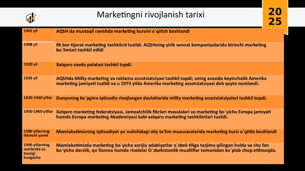 Marketingni rivojlanish tarixi 20 25 1902 yil AQSH da mustaqil ravishda marketing kursini o`qitish boshlandi 1908 yil Ilk bor tijorat marketing tashkiloti tuzildi. AQSHning yirik sanoat kompaniyalarida birinchi marketing bo`limlari tashkil etildi 1920 yil Xalqaro savdo palatasi tashkil topdi. 1926 yil AQSHda Milliy marketing va reklama assotsiatsiyasi tashkil topdi ; uning asosida keyinchalik Amerika marketing jamiyati tuzildi va u 1973 yilda Amerika marketing assotsiatsiyasi deb qayta nomlandi. 1930-1940 yillar Dunyoning ko`pgina iqtisodiy rivojlangan davlatlarida milliy marketing assotsiatsiyalari tashkil topdi. 1950-1960 yilllar Xalqaro marketing federatsiyasi, Jamoatchilik fikrlari masalalari va marketing bo`yicha Evropa jamiyati hamda Evropa marketing Akademiyasi kabi xalqaro marketing tashkilotlari tuzildi. 1980 yillarning ikkinchi yarmi Mamlakatimizning iqtisodiyot yo`nalishidagi oliy ta‘lim muassasalarida marketing kursi o`qitila boshlandi 1990 yillarning oxirlarida va hozirgi kungacha Mamlakatimizda marketing bo`yicha xorijiy adabiyotlar o`zbek tiliga tarjima qilingan holda va shu fan bo`yicha darslik, qo`llanma hamda risolalar O`zbekistonlik mualliflar tomonidan ko`plab chop etilmoqda.