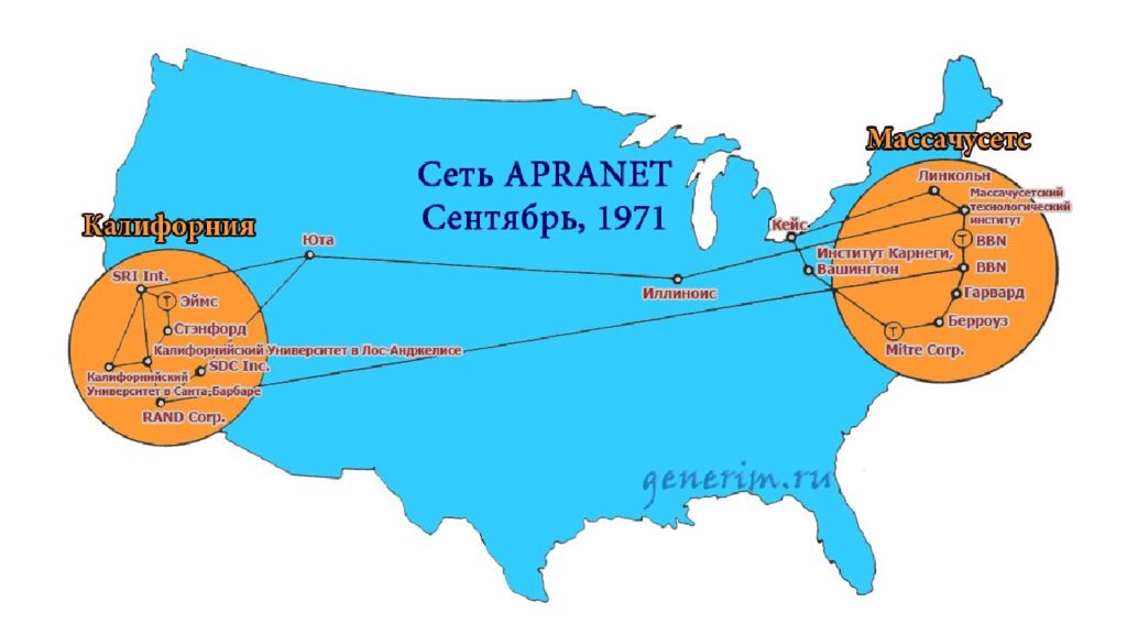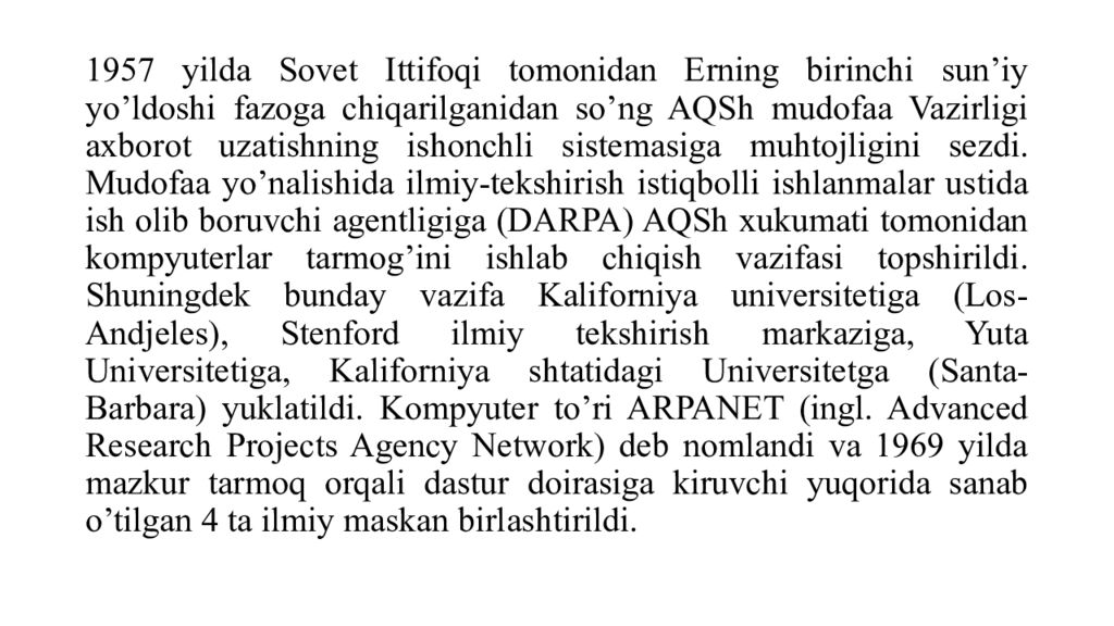 1957 yilda Sovet Ittifoqi tomonidan Erning birinchi sun’iy yo’ldoshi fazoga chiqarilganidan so’ng AQSh mudofaa Vazirligi axborot uzatishning ishonchli sistemasiga muhtojligini sezdi. Mudofaa yo’nalishida ilmiy-tekshirish istiqbolli ishlanmalar ustida ish olib boruvchi agentligiga (DARPA) AQSh xukumati tomonidan kompyuterlar tarmog’ini ishlab chiqish vazifasi topshirildi. Shuningdek bunday vazifa Kaliforniya universitetiga (Los- Andjeles ), Stenford ilmiy tekshirish markaziga, Yuta Universitetiga, Kaliforniya shtatidagi Universitetga (Santa-Barbara) yuklatildi. Kompyuter to’ri ARPANET ( ingl. Advanced Research Projects Agency Network) deb nomlandi va 1969 yilda mazkur tarmoq orqali dastur doirasiga kiruvchi yuqorida sanab o’tilgan 4 ta ilmiy maskan birlashtirildi.