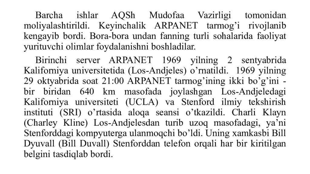 Barcha ishlar AQSh Mudofaa Vazirligi tomonidan moliyalashtirildi. Keyinchalik ARPANET tarmog’i rivojlanib kengayib bordi. Bora-bora undan fanning turli sohalarida faoliyat yurituvchi olimlar foydalanishni boshladilar. Birinchi server ARPANET 1969 yilning 2 sentyabrida Kaliforniya universitetida (Los- Andjeles ) o’rnatildi. 1969 yilning 29 oktyabrida soat 21:00 ARPANET tarmog’ining ikki bo’g’ini - bir biridan 640 km masofada joylashgan Los- Andjeledagi Kaliforniya universiteti (UCLA) va Stenford ilmiy tekshirish instituti (SRI) o’rtasida aloqa seansi o’tkazildi. Charli Klayn (Charley Kline) Los- Andjelesdan turib uzoq masofadagi, ya’ni Stenforddagi kompyuterga ulanmoqchi bo’ldi. Uning xamkasbi Bill Dyuvall (Bill Duvall) Stenforddan telefon orqali har bir kiritilgan belgini tasdiqlab bordi.