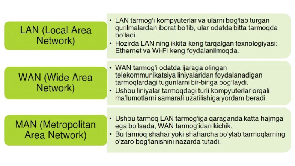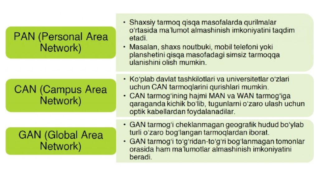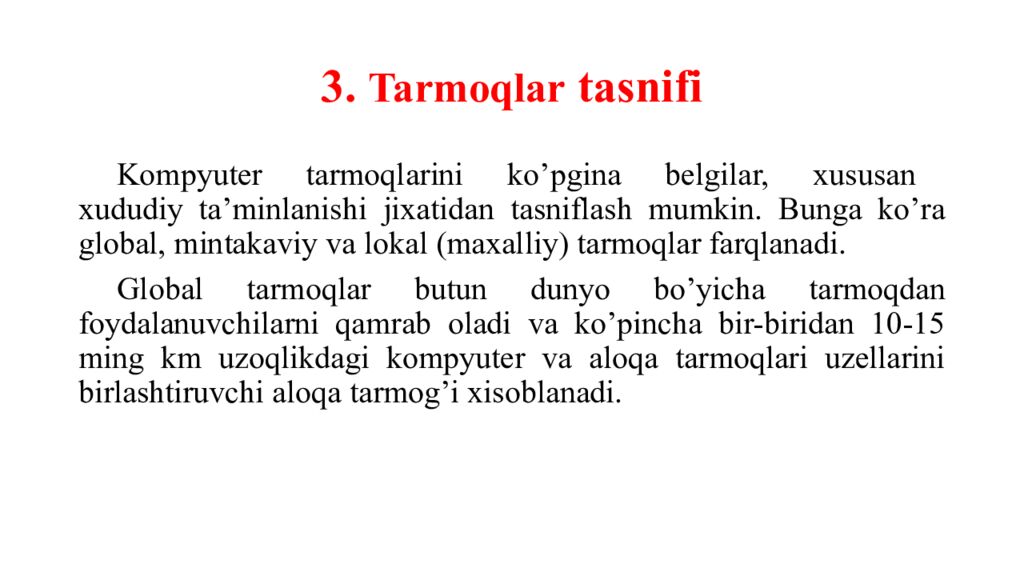 Kompyuter tarmoqlarini ko’pgina belgilar, xususan xududiy ta’minlanishi jixatidan tasniflash mumkin. Bunga ko’ra global, mintakaviy va lokal ( maxalliy ) tarmoqlar farqlanadi. Global tarmoqlar butun dunyo bo’yicha tarmoqdan foydalanuvchilarni qamrab oladi va ko’pincha bir-biridan 10-15 ming km uzoqlikdagi kompyuter va aloqa tarmoqlari uzellarini birlashtiruvchi aloqa tarmog’i xisoblanadi.