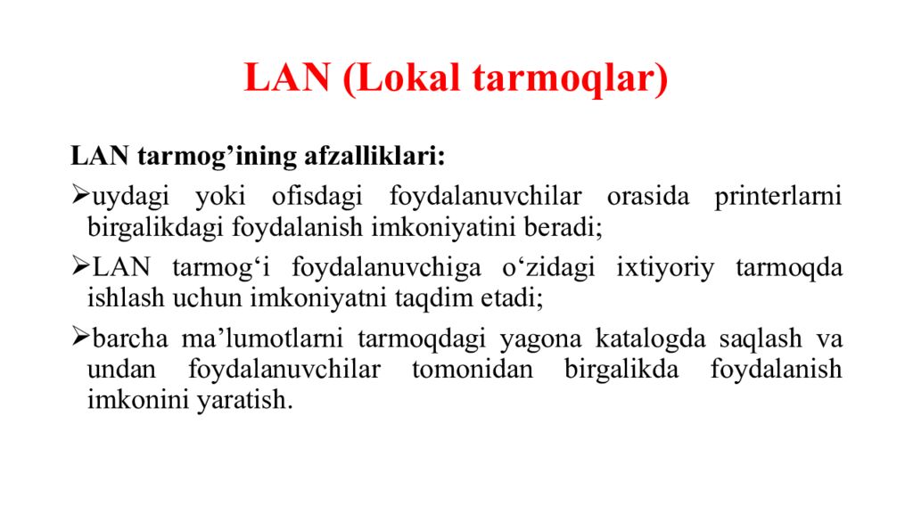 LAN tarmog’ining afzalliklari : uydagi yoki ofisdagi foydalanuvchilar orasida printerlarni birgalikdagi foydalanish imkoniyatini beradi ; LAN tarmog‘i foydalanuvchiga о‘ zidagi ixtiyoriy tarmoqda ishlash uchun imkoniyatni taqdim etadi ; barcha ma’lumotlarni tarmoqdagi yagona katalogda saqlash va undan foydalanuvchilar tomonidan birgalikda foydalanish imkonini yaratish.