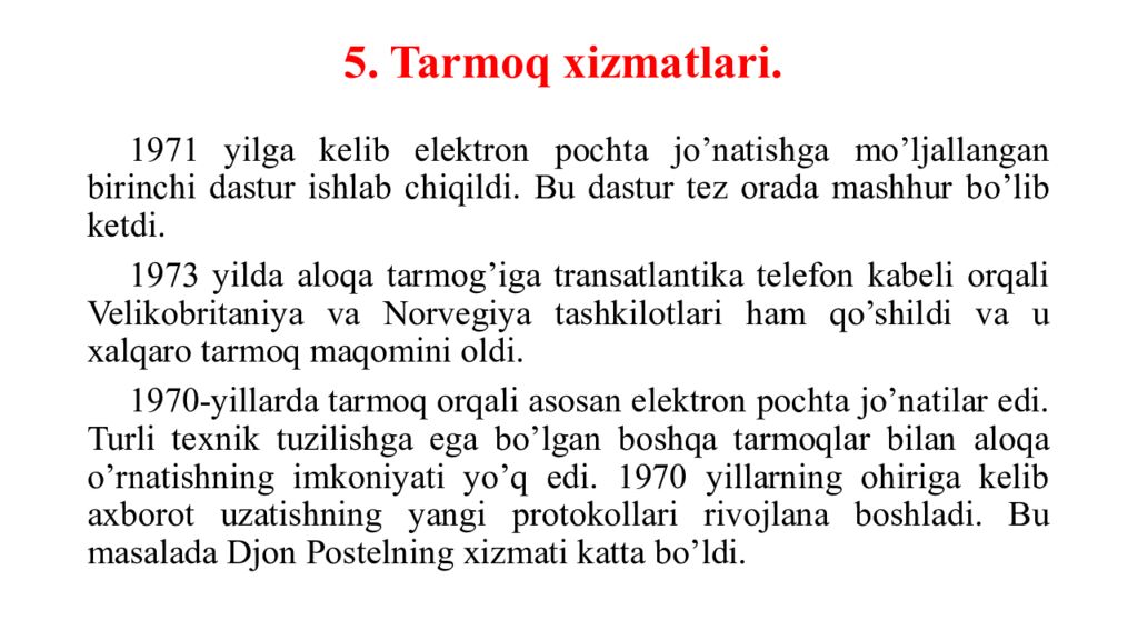 1971 yilga kelib elektron pochta jo’natishga mo’ljallangan birinchi dastur ishlab chiqildi. Bu dastur tez orada mashhur bo’lib ketdi. 1973 yilda aloqa tarmog’iga transatlantika telefon kabeli orqali Velikobritaniya va Norvegiya tashkilotlari ham qo’shildi va u xalqaro tarmoq maqomini oldi. 1970-yillarda tarmoq orqali asosan elektron pochta jo’natilar edi. Turli texnik tuzilishga ega bo’lgan boshqa tarmoqlar bilan aloqa o’rnatishning imkoniyati yo’q edi. 1970 yillarning ohiriga kelib axborot uzatishning yangi protokollari rivojlana boshladi. Bu masalada Djon Postelning xizmati katta bo’ldi.