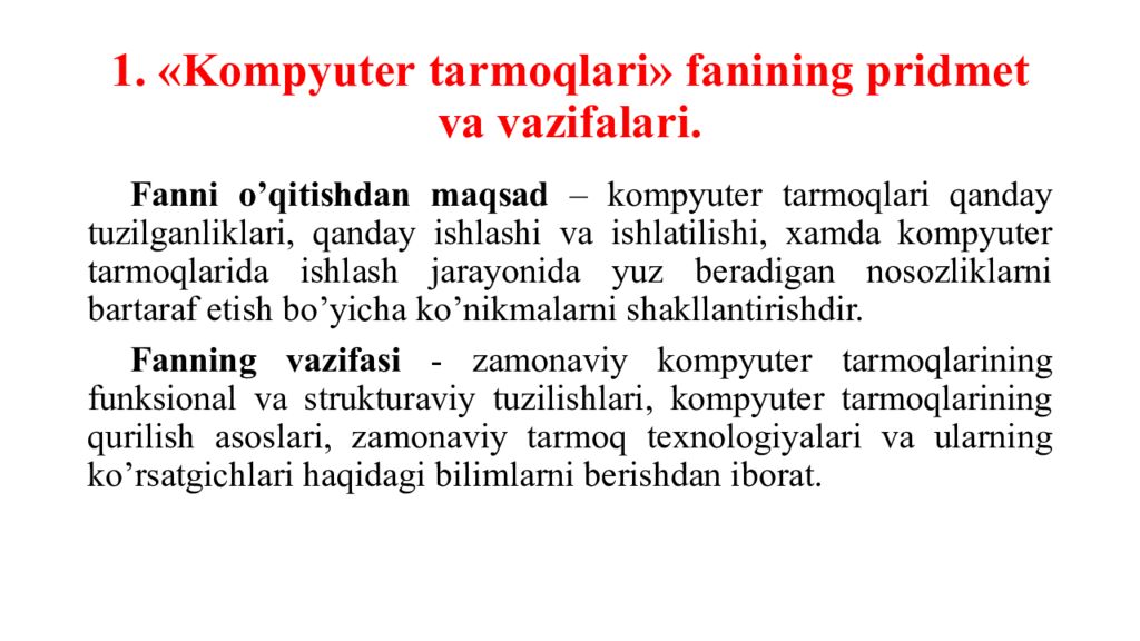 Fanni o’qitishdan maqsad – kompyuter tarmoqlari qanday tuzilganliklari, qanday ishlashi va ishlatilishi, xamda kompyuter tarmoqlarida ishlash jarayonida yuz beradigan nosozliklarni bartaraf etish bo’yicha ko’nikmalarni shakllantirishdir. Fanning vazifasi - zamonaviy kompyuter tarmoqlarining funksional va strukturaviy tuzilishlari, kompyuter tarmoqlarining qurilish asoslari, zamonaviy tarmoq texnologiyalari va ularning ko’rsatgichlari haqidagi bilimlarni berishdan iborat.