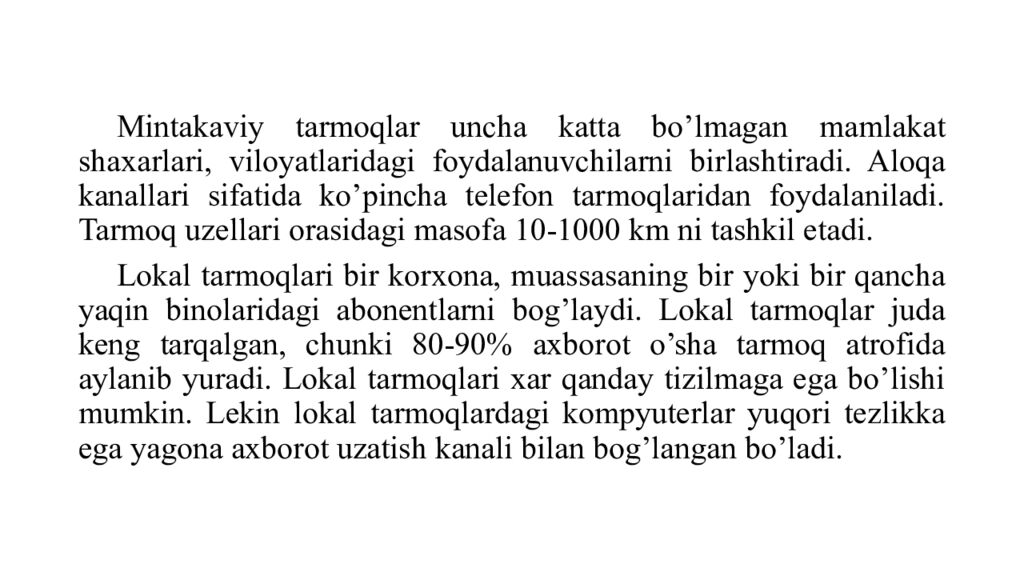 Mintakaviy tarmoqlar uncha katta bo’lmagan mamlakat shaxarlari, viloyatlaridagi foydalanuvchilarni birlashtiradi. Aloqa kanallari sifatida ko’pincha telefon tarmoqlaridan foydalaniladi. Tarmoq uzellari orasidagi masofa 10-1000 km ni tashkil etadi. Lokal tarmoqlari bir korxona, muassasaning bir yoki bir qancha yaqin binolaridagi abonentlarni bog’laydi. Lokal tarmoqlar juda keng tarqalgan, chunki 80-90% axborot o’sha tarmoq atrofida aylanib yuradi. Lokal tarmoqlari xar qanday tizilmaga ega bo’lishi mumkin. Lekin lokal tarmoqlardagi kompyuterlar yuqori tezlikka ega yagona axborot uzatish kanali bilan bog’langan bo’ladi.