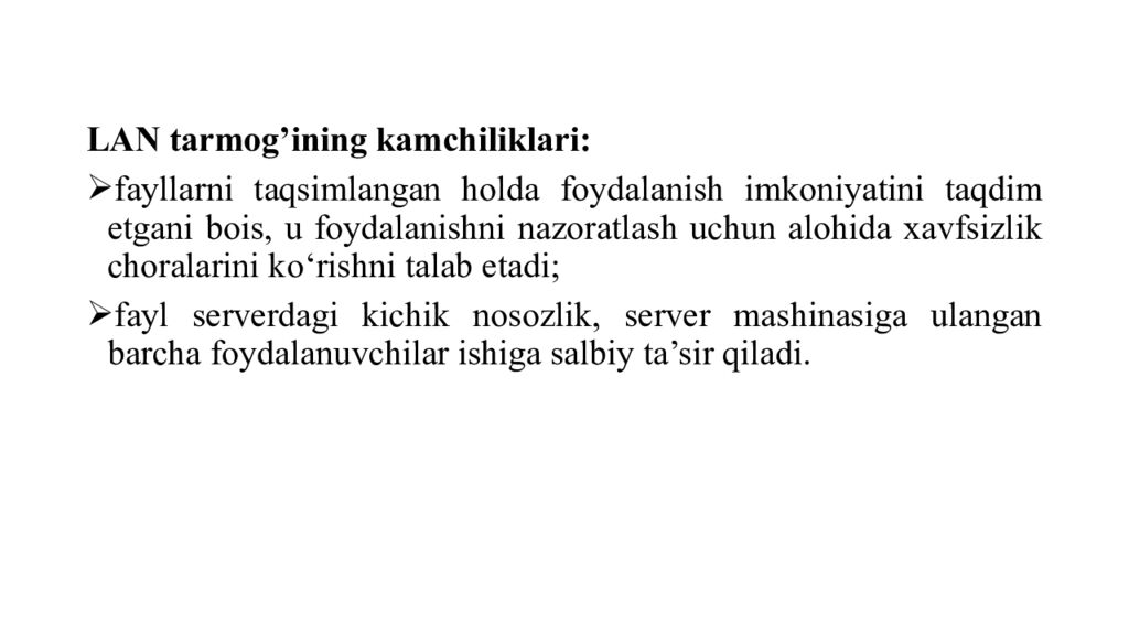 LAN tarmog’ining kamchiliklari : fayllarni taqsimlangan holda foydalanish imkoniyatini taqdim etgani bois, u foydalanishni nazoratlash uchun alohida xavfsizlik choralarini k о‘ rishni talab etadi ; fayl serverdagi kichik nosozlik, server mashinasiga ulangan barcha foydalanuvchilar ishiga salbiy ta’sir qiladi.