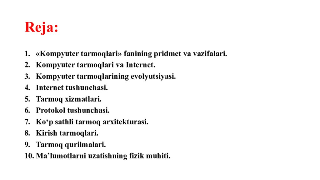 « Kompyuter tarmoqlari » fanining pridmet va vazifalari. Kompyuter tarmoqlari va Internet. Kompyuter tarmoqlarining evolyutsiyasi. Internet tushunchasi. Tarmoq xizmatlari. Protokol tushunchasi. Ko‘p sathli tarmoq arxitekturasi. Kirish tarmoqlari. Tarmoq qurilmalari. Ma’lumotlarni uzatishning fizik muhiti.