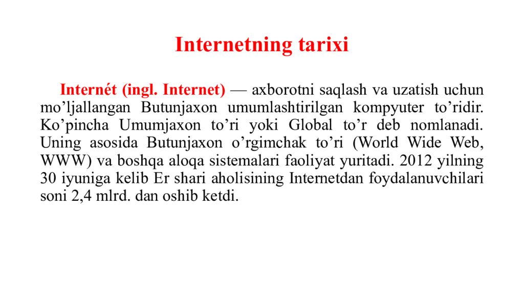 Xozirda kompyuterlarni qo’llashda ko’pgina foydalanuvchilar uchun yagona axborot makonini ta’riflovchi tarmoqlarni tashkil etish muhim ahamiyatga ega. Buni butun dunyo kompyuter tarmogi hisoblanmish Internet misolida yaqqol ko’rish mumkin. Uzatish kanallari orqali o’zaro bog’langan kompyuterlar majmuiga kompyuterlar tarmog’i deyiladi. Bu tarmoq undan foydalanuvchilarni axborot almashuv vositasi va apparat, dastur xamda axborot tarmog’i resurslaridan jamoa bo’lib foydalanishni ta’minlaydi.