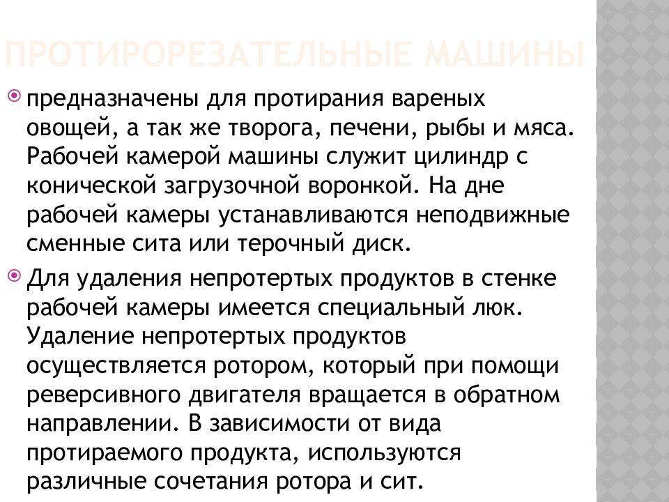 предназначены для протирания вареных овощей, а так же творога, печени, рыбы и мяса. Рабочей камерой машины служит цилиндр с конической загрузочной воронкой. На дне рабочей камеры устанавливаются неподвижные сменные сита или терочный диск. Для удаления непротертых продуктов в стенке рабочей камеры имеется специальный люк. Удаление непротертых продуктов осуществляется ротором, который при помощи реверсивного двигателя вращается в обратном направлении. В зависимости от вида протираемого продукта, используются различные сочетания ротора и сит.