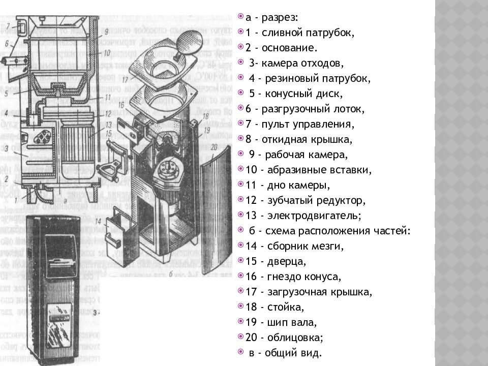 а - разрез: 1 - сливной патрубок, 2 - основание. 3- камера отходов, 4 - резиновый патрубок, 5 - конусный диск, 6 - разгрузочный лоток, 7 - пульт управления, 8 - откидная крышка, 9 - рабочая камера, 10 - абразивные вставки, 11 - дно камеры, 12 - зубчатый редуктор, 13 - электродвигатель; б - схема расположения частей: 14 - сборник мезги, 15 - дверца, 16 - гнездо конуса, 17 - загрузочная крышка, 18 - стойка, 19 - шип вала, 20 - облицовка; в - общий вид.