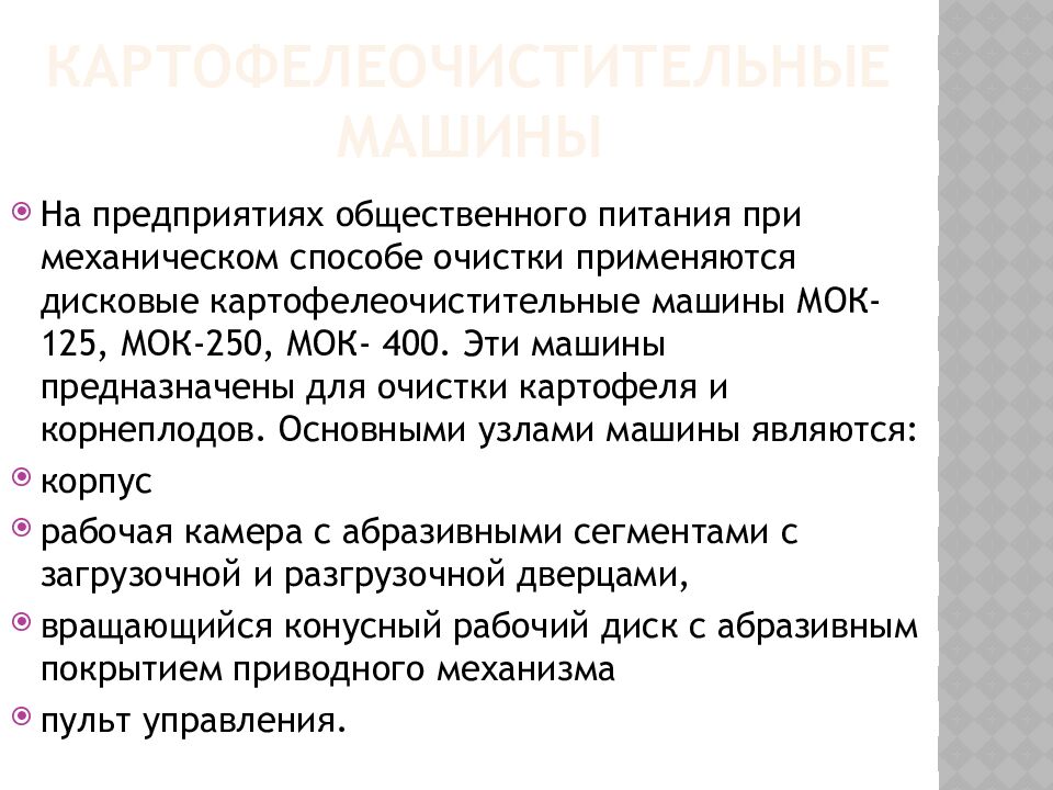 На предприятиях общественного питания при механическом способе очистки применяются дисковые картофелеочистительные машины МОК-125, МОК-250, МОК- 400. Эти машины предназначены для очистки картофеля и корнеплодов. Основными узлами машины являются: корпус рабочая камера с абразивными сегментами с загрузочной и разгрузочной дверцами, вращающийся конусный рабочий диск с абразивным покрытием приводного механизма пульт управления.