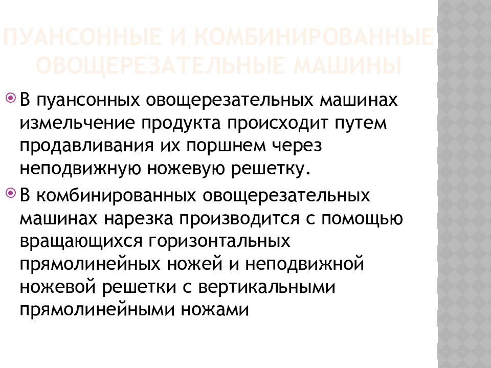 В пуансонных овощерезательных машинах измельчение продукта происходит путем продавливания их поршнем через неподвижную ножевую решетку. В комбинированных овощерезательных машинах нарезка производится с помощью вращающихся горизонтальных прямолинейных ножей и неподвижной ножевой решетки с вертикальными прямолинейными ножами