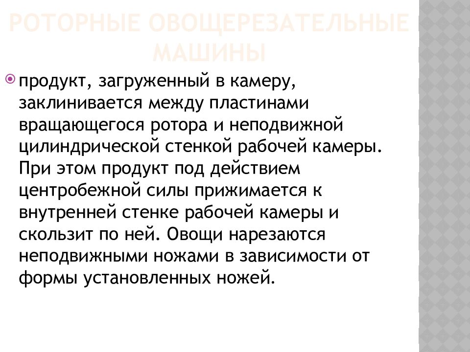 продукт, загруженный в камеру, заклинивается между пластинами вращающегося ротора и неподвижной цилиндрической стенкой рабочей камеры. При этом продукт под действием центробежной силы прижимается к внутренней стенке рабочей камеры и скользит по ней. Овощи нарезаются неподвижными ножами в зависимости от формы установленных ножей.