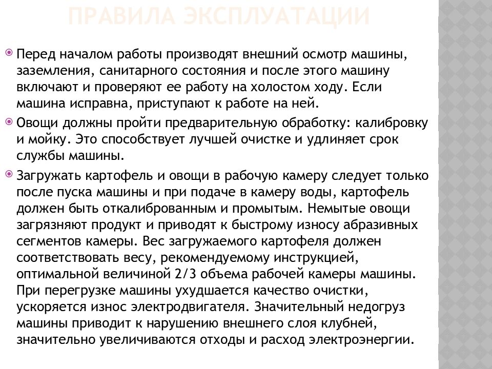 Перед началом работы производят внешний осмотр машины, заземления, санитарного состояния и после этого машину включают и проверяют ее работу на холостом ходу. Если машина исправна, приступают к работе на ней. Овощи должны пройти предварительную обработку: калибровку и мойку. Это способствует лучшей очистке и удлиняет срок службы машины. Загружать картофель и овощи в рабочую камеру следует только после пуска машины и при подаче в камеру воды, картофель должен быть откалиброванным и промытым. Немытые овощи загрязняют продукт и приводят к быстрому износу абразивных сегментов камеры. Вес загружаемого картофеля должен соответствовать весу, рекомендуемому инструкцией, оптимальной величиной 2/3 объема рабочей камеры машины. При перегрузке машины ухудшается качество очистки, ускоряется износ электродвигателя. Значительный недогруз машины приводит к нарушению внешнего слоя клубней, значительно увеличиваются отходы и расход электроэнергии.