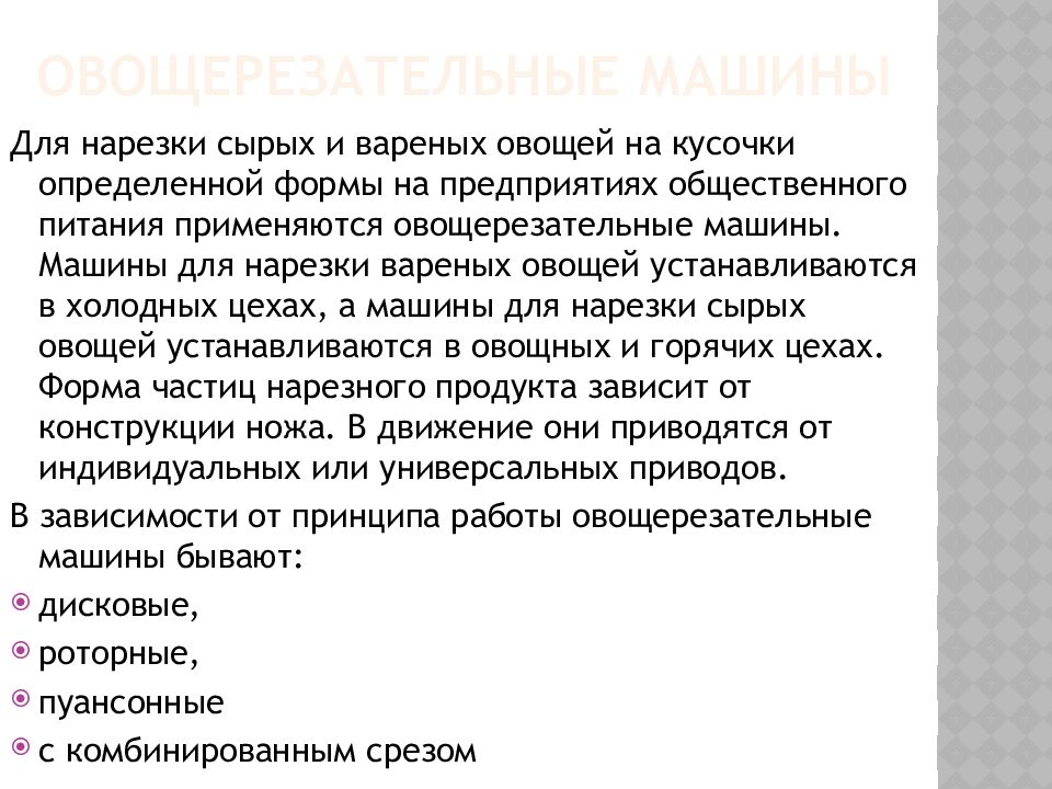 Для нарезки сырых и вареных овощей на кусочки определенной формы на предприятиях общественного питания применяются овощерезательные машины. Машины для нарезки вареных овощей устанавливаются в холодных цехах, а машины для нарезки сырых овощей устанавливаются в овощных и горячих цехах. Форма частиц нарезного продукта зависит от конструкции ножа. В движение они приводятся от индивидуальных или универсальных приводов. В зависимости от принципа работы овощерезательные машины бывают: дисковые, роторные, пуансонные с комбинированным срезом